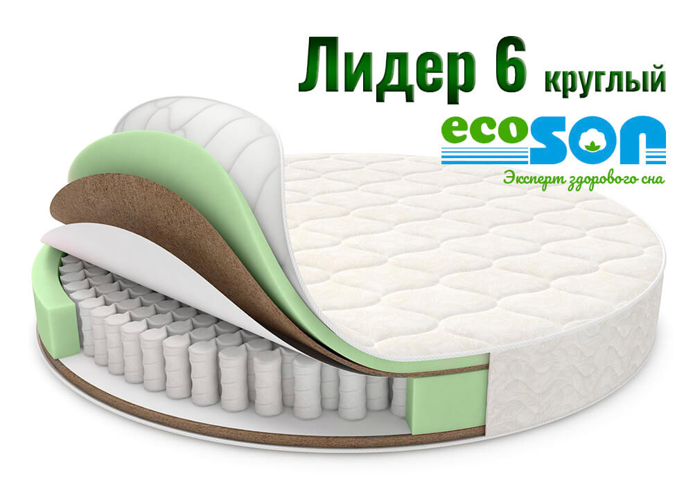 Универсальный круглый матрас средней толщины «Лидер-6». Благодаря двум сторонам различной степени жесткости он подходит для большинства кроватей и обеспечивает необходимую степень комфорта. С одной стороны используются слои экопены и техлопласта, благодаря чему достигается максимальный расслабляющий эффект и хорошие теплообменные свойства, а с другой применены кокосовые слои для придания дополнительной жесткости и создания хорошей циркуляции воздуха. Кроме того в матрасе используется блок независимых и бесшумных пружин. Каждая пружина отдельно принимает на себя вес, благодаря чему тело во время сна сохраняет правильное анатомическое положение. Слой из натуральный волокон кокоса — один из наиболее популярных и лучших материалов для придания жесткости матрасу, обладает высокой степенью износостойкости и устойчивости к нагрузкам, экологический и обладает антибактериальными свойствами.