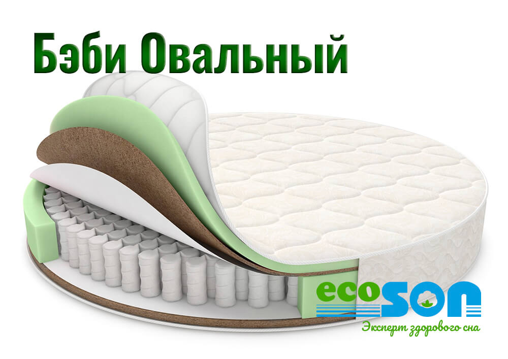Основной для матраса средней жесткости «Бэби Овальный» служит пружинный блок независимых пружин и кокосовые слои по обе стороны матраса. Благодаря компоновке, пружины не соприкасаются друг с другом, следовательно, не издают шума и скрипов. Независимо расположенные пружины, точечно реагируют на создаваемое давление, сохраняя правильное положение позвоночника. Кокосовый слой, придает необходимую жесткость, обеспечивает правильное распределение веса и благотворно влияют на состояние позвоночника во время сна, а так же натуральный материал обеспечивает хороший воздухообмен самого матраса. Кроме благотворного ортопедического воздействия, матрасы серии «Бэби овальный», обладают высокими параметрами устойчивости к нагрузкам и служат своим хозяевам долгие годы.