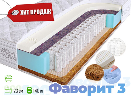 Ортопедический матрас «Фаворит-3», с блоком независимых пружин с дополнительными слоями экопены, поможет убрать избыточное мышечное напряжение, поспособствует улучшению кровообращения. Использование такого матраса обеспечит правильную поддержку опорно-двигательного аппарата, независимо от того в какой позе Вы предпочитаете спать. Матрас «Фаворит-3» создаст благоприятный климат для сна. Специальный кокосовый слой, обеспечит высокую долговечность и прочность матраса. Применяемые материалы совершенно не токсичны, обладают гипоаллергенными свойствами и высокой эластичность, выдерживают длительные и интенсивные нагрузки. Специальный трикотаж чехла, позволяет сохранять уникальные свойства применяемый материалов и слоев волокон, продлевая срок службы матрасов.
