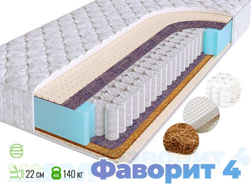 Ортопедический матрас «Фаворит-4», с блоком независимых пружин с дополнительными слоями экопены, поможет убрать избыточное мышечное напряжение, поспособствует улучшению кровообращения. Использование такого матраса обеспечит правильную поддержку опорно-двигательного аппарата, независимо от того в какой позе Вы предпочитаете спать. Матрас «Фаворит-4» создаст благоприятный климат для сна. Специальный кокосовый слой, обеспечит высокую долговечность и прочность матраса. Применяемые материалы совершенно не токсичны, обладают гипоаллергенными свойствами и высокой эластичность, выдерживают длительные и интенсивные нагрузки. Специальный трикотаж чехла, позволяет сохранять уникальные свойства применяемый материалов и слоев волокон, продлевая срок службы матрасов.