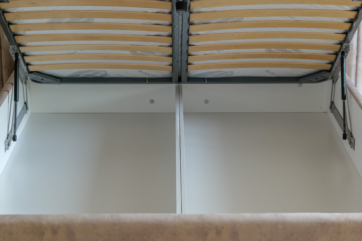 Кровать оборудована просторной нишей для хранения с подъемным механизмом.