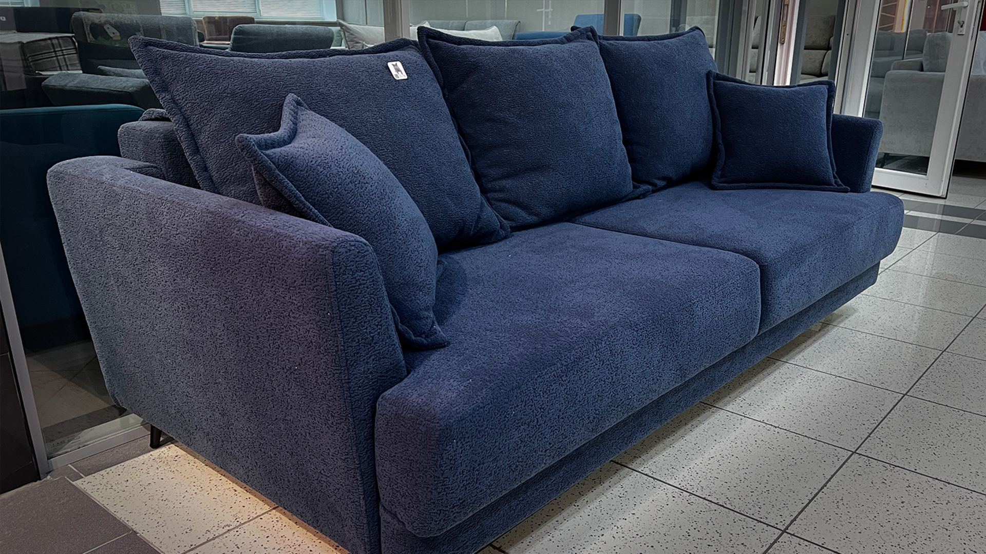 Этот элегантный диван с мягкой текстурной тканью и объёмными подушками — идеальное решение для тех, кто ценит уют, практичность и современный дизайн. Благодаря глубокому синему оттенку он становится выразительным акцентом интерьера, при этом легко сочетается с другими элементами декора.