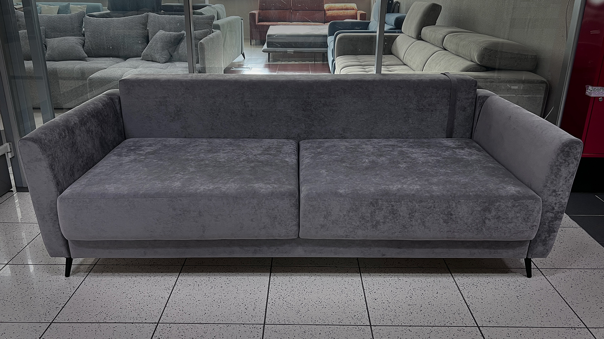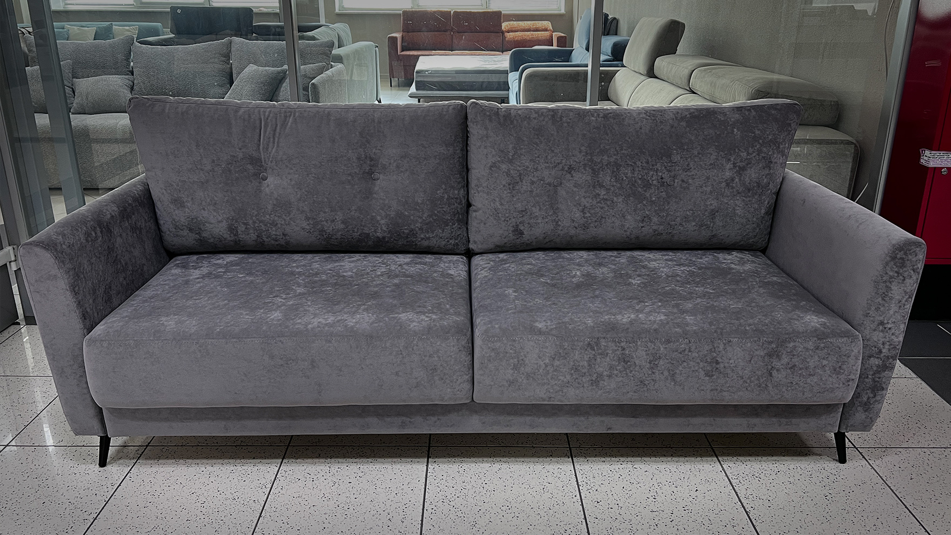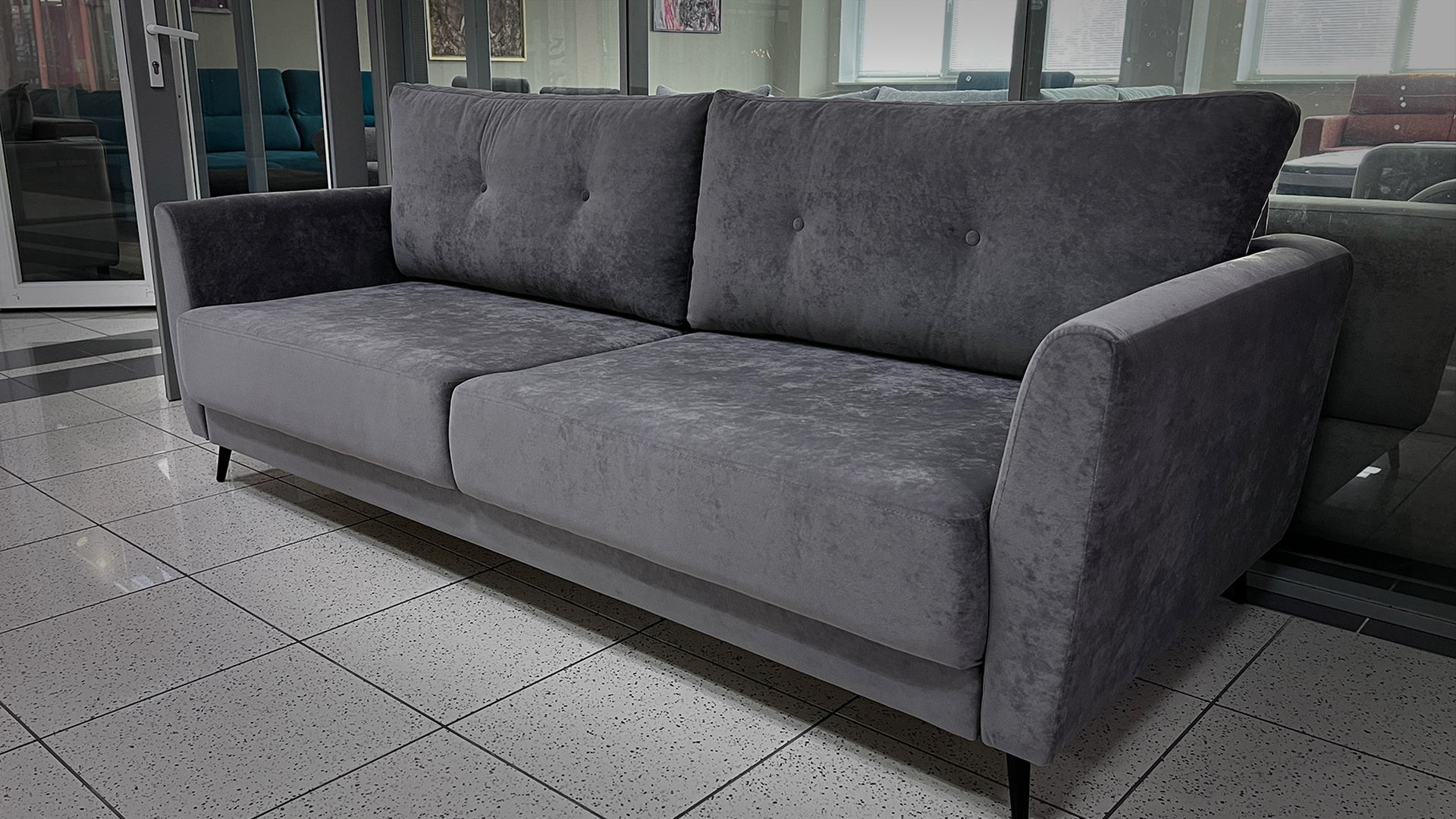 Небольшой темно-серый диван — компактный и комфортный с мягкой велюровой обивкой
