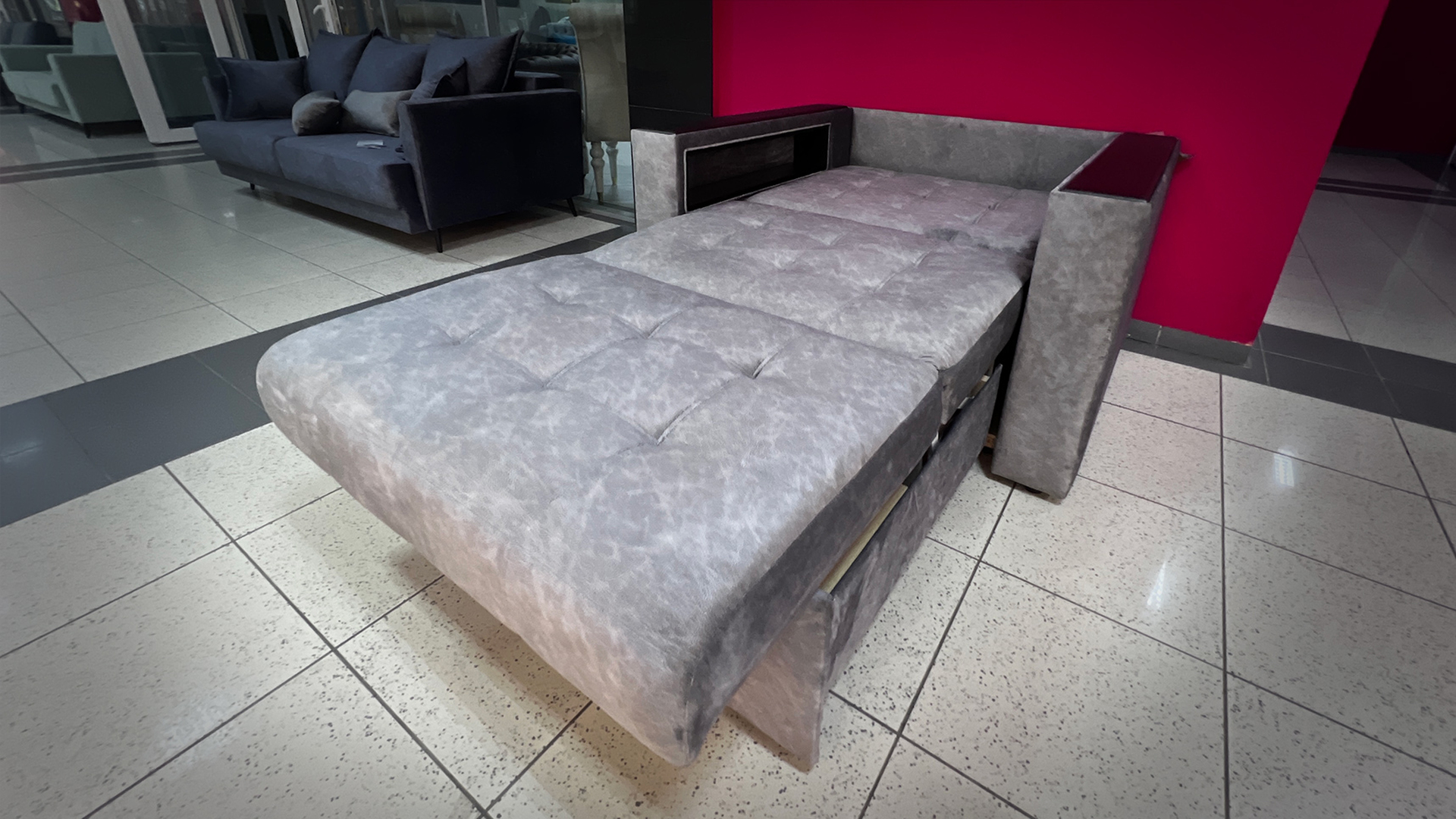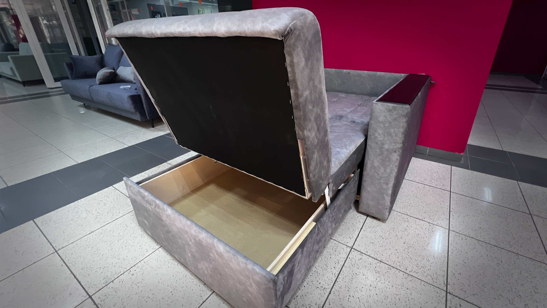 Обивка выполнена из мягкой, приятной на ощупь ткани с лёгким бархатистым эффектом. Материал устойчив к износу и сохраняет аккуратный внешний вид даже при активной эксплуатации. Широкие подлокотники оснащены встроенными нишами — удобное решение для хранения подушек, пледа или мелочей, которые всегда должны быть рядом.